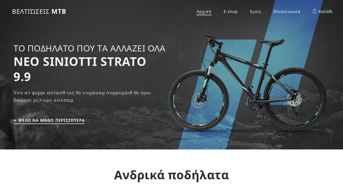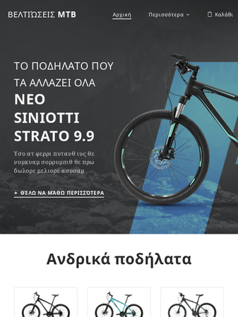 Αποκτήστε το δικό σας e-shop για ποδήλατα σε ένα λεπτό. Το εντυπωσιακό αυτό template όχι μόνο τραβά το μάτι του επισκέπτη, αλλά προσφέρει και εύκολη διαχείριση του καταστήματός σας. Η καλά οργανωμένη γκαλερί προϊόντων βοηθά τους πελάτες να επιλέξουν το ποδήλατο ή τα ανταλλακτικά που θέλουν, ενώ η εύκολη διαδικασία checkout εγγυάται πως θα κάνει τις αγορές να μοιάζουν με μια εύκολη βόλτα. Σύντομα θα μπορείτε να πουλάτε ποδήλατα σε όλο τον κόσμο!